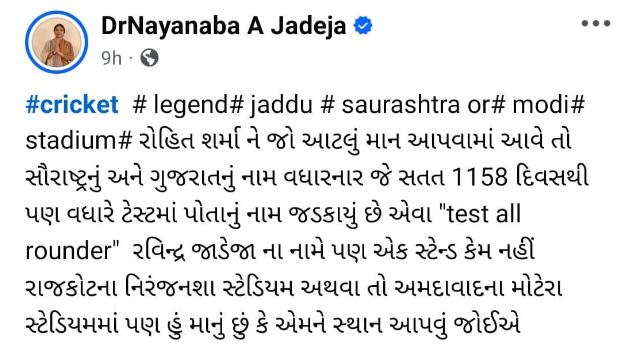 ત્યારે ક્રિકેટર રવિન્દ્ર જાડેજાની બહેન નયનાબા જાડેજાએ પોતાના ભાઈને આવું સન્માન મળવું જોઈએ તેવી માંગ કરી છે. નયનાબા જાડેજાએ સૌરાષ્ટ્ર ક્રિકેટ એસોસીએશન સમક્ષ આ માંગ કરી છે. ક્રિકેટર રવીન્દ્ર જાડેજાના બહેને ફેસબુક પર એક પોસ્ટ મૂકીને રાજકોટના નિરંજન શાહ અથવા અમદાવાદના મોટેરા નરેન્દ્ર મોદી ક્રિકેટ સ્ટેડિયમમાં રવીન્દ્ર જાડેજાના નામે સ્ટેન્ડ બનાવવા માંગ કરી છે. આ સાથે તેમણે ચેતેશ્વર પૂજારા અને સલીમ દુરાનીના નામે પણ SCA સ્ટેડિયમમાં સ્ટેન્ડ બનવું જોઇએ તેમ જણાવ્યું હતું.