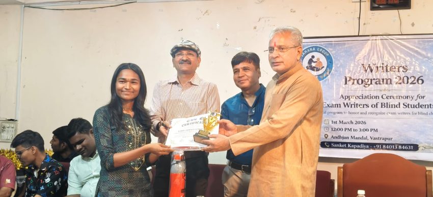 અમદાવાદ સ્થિત અંધજન મંડળ ખાતે તા. ૧ માર્ચ, ૨૦૨૬ના રોજ સહારા ગ્રુપ દ્વારા “રાઇટર્સ સન્માન સમારોહ”નું ભવ્ય આયોજન કરવામાં આવ્યું હતું. આ સમારોહ ખાસ કરીને પ્રજ્ઞાચક્ષુ વિદ્યાર્થીઓ માટે પરીક્ષા દરમિયાન પેપર લખી આપતા લહિયાઓ (Writers/Scribes)ના નિસ્વાર્થ સેવાભાવને કદર કરવા માટે સમર્પિત હતો.